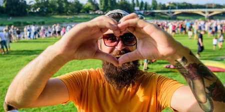 Man bearded hipster in front of crowd people show heart gesture riverside background. Hipster happy celebrate event picnic fest festival. Cheerful fan love summer fest. I love summer holiday festival