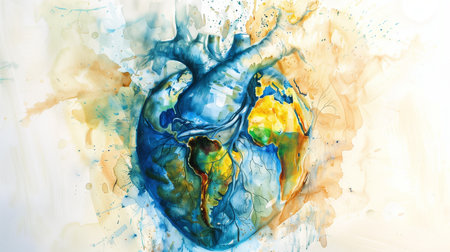Earth's heart, pulsing in watercolor veins, close-up illustration, inviting impactful dialogue