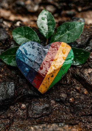 Heart-shaped stone with colorful stripes and water droplets, surrounded by green leaves