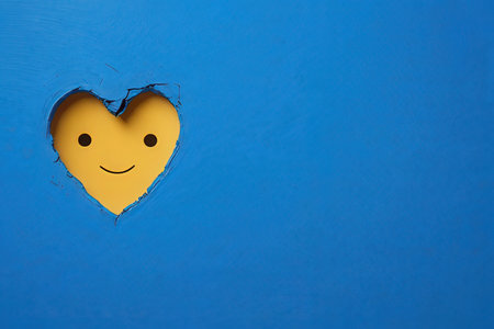 Smiling face in a hole in a blue wall with a yellow heart