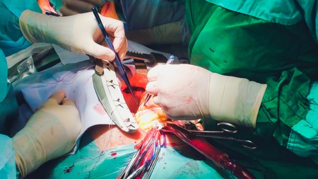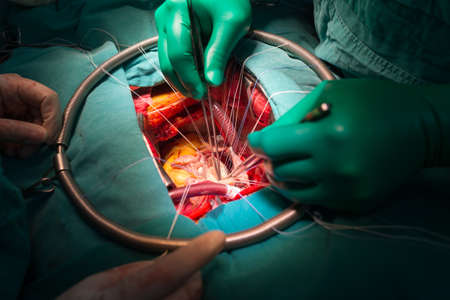 Surgeon hands are tying a knot during the open heart procedure chest during heart surgery