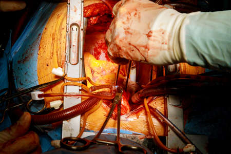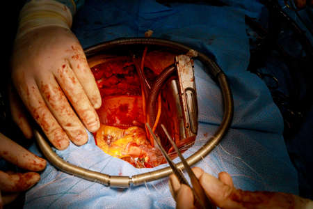 Human heart during cardiac surgery transplantation. Surgeon view chest during heart surgery surgical instruments close-up