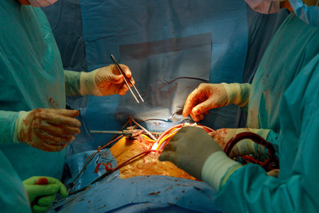 Teamwork surgeons during open heart surgery doctor holding surgical instruments during medical procedure at clinic