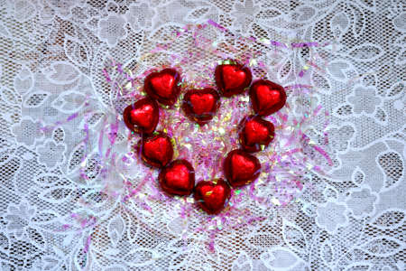 A romantic flat lay of multiple heart-shaped Valentine chocolates, arranged on a delicate lace tablecloth.