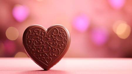 Chocolate heart on a pink background with bokeh. Valentine's Day card with copy space.