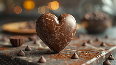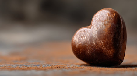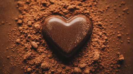 Heart-shaped chocolate rests on a bed of cocoa powder, perfect for romantic occasions. This image captures rich textures and warm tones ideal for love-themed projects.