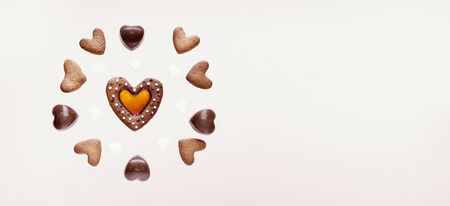 Floating flying heart shaped cookies light bright background isolated gluten-free caramel ginger biscuits. Saint Valentine's Day concept holiday greeting card. Romantic love date