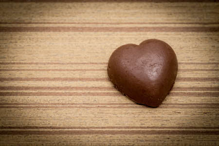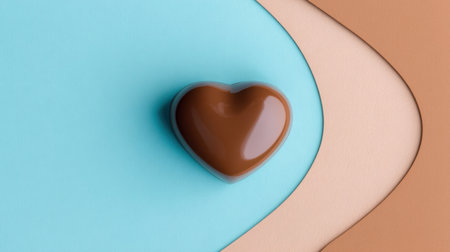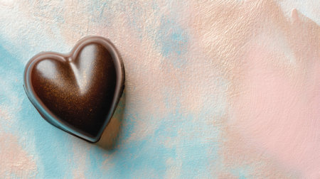 A heart-shaped chocolate sits elegantly on a pastel-colored background, showcasing rich textures and warm tones, perfect for romantic and sweet treat concepts.