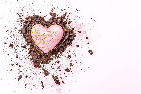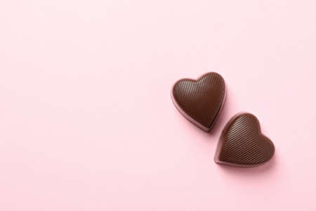 Heart-shaped chocolate pieces over pink background, abstract food love background