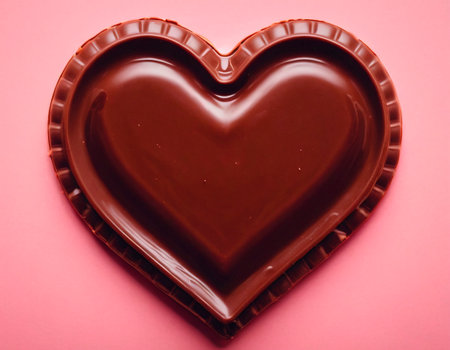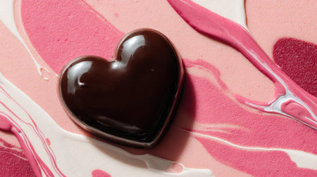 A dark chocolate heart rests on a vibrant and swirling pink and cream background, perfectly capturing the essence of romance and artistic flair for special occasions.