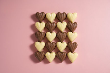 A vibrant arrangement of heart-shaped chocolates on a soft pink surface. Ideal for celebrating love, special occasions, or gifting delightful treats.