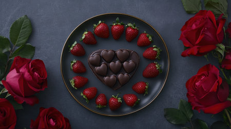 A top-down shot of Valentine chocolate strawberries arranged in a heart shape on a plate, surrounded by fresh red roses.