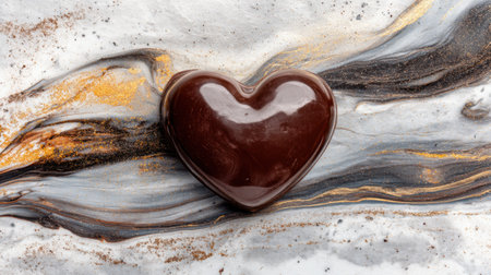 Heart-shaped chocolate rests elegantly on a marble background featuring golden swirls, creating a visually stunning element perfect for desserts and special occasions.