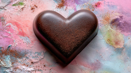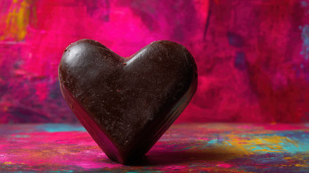 A striking dark chocolate heart sits against a colorful and vibrant abstract background, perfect for a romantic setting or as a delightful gift for loved ones.