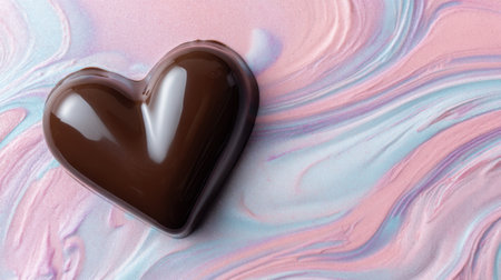 A heart-shaped chocolate piece rests on a beautifully swirled pastel background, creating an inviting and romantic atmosphere ideal for desserts or celebrations.