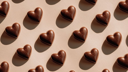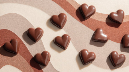 A visually appealing arrangement of heart-shaped chocolate candies on a cream background, perfect for enhancing celebrations, romantic occasions, or sweet indulgences.