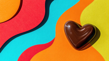 A vibrant composition featuring a heart-shaped chocolate on wavy colored paper, ideal for themes of love, celebration, and sweet indulgence. Perfect for creative projects.