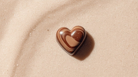A delectable heart-shaped chocolate treat sits on a smooth sandy beach, symbolizing love and sweetness, perfect for romantic moments and indulgent celebrations.