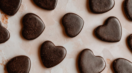 A delightful arrangement of heart-shaped dark chocolate treats on a light marble surface, capturing the essence of romance and sweetness perfect for various occasions.