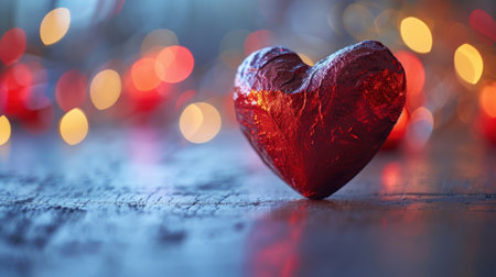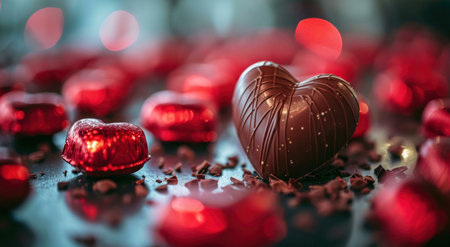 A chocolate heart amidst red candy wrappers on a reflective surface with warm bokeh lights.