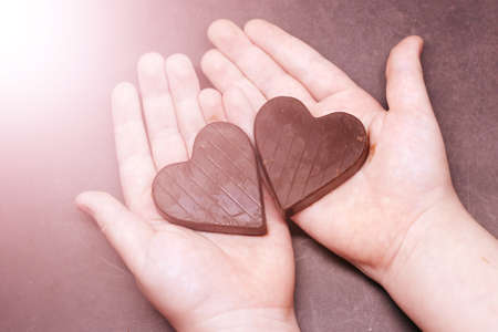 Sweet delicious sweets in the form of chocolate hearts in a white saucer. Celebrating Valentine's Day