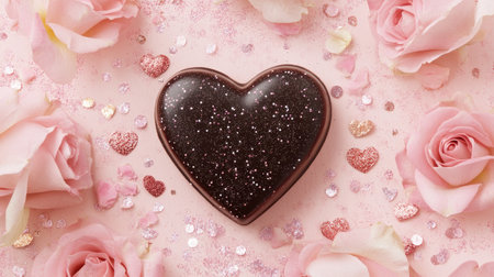 A heart-shaped chocolate centerpiece rests among delicate pink roses and sparkling glitter, creating a romantic and festive atmosphere perfect for celebrations or gifts.