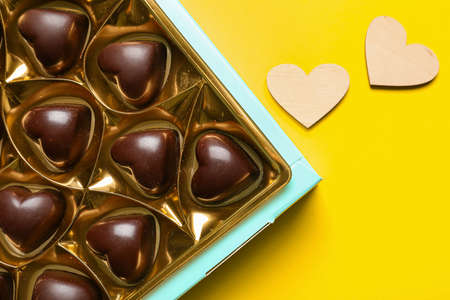 Heart shaped chocolate candies in box on dark background, valentines day concept