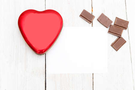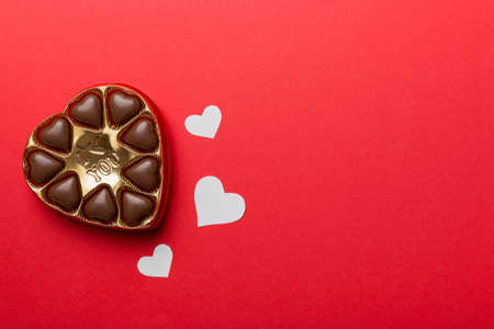 Delicious chocolate pralines in red box for Valentine's Day. Heart shaped box of chocolates top view with copy space.