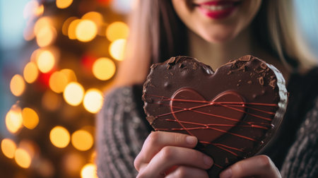 In the glow of twinkling lights, a woman cradles a heart-shaped chocolate box. Ai Generated