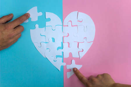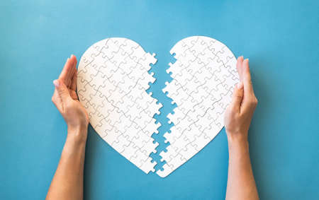 White puzzle in heart shape. Hands connect white details of puzzle on blue background. Heart health concept