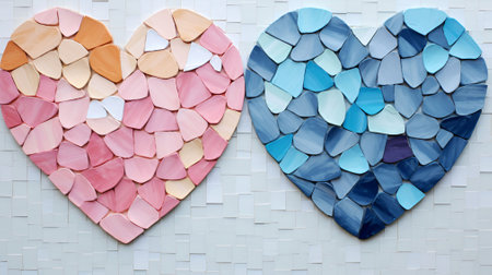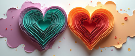 Two beautifully crafted paper hearts in vibrant colors—one teal and the other orange—are artistically layered against a soft pastel background. The image radiates creativity and love, showcasing the intricate details of the paper art and the playful splashes of color surrounding the hearts.