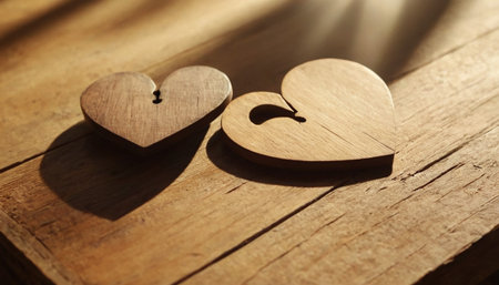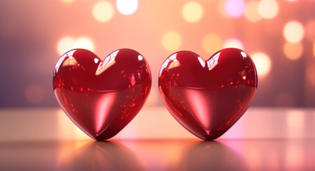 Romantic red heart figurines on textured surface with soft bokeh background.