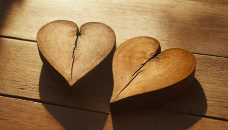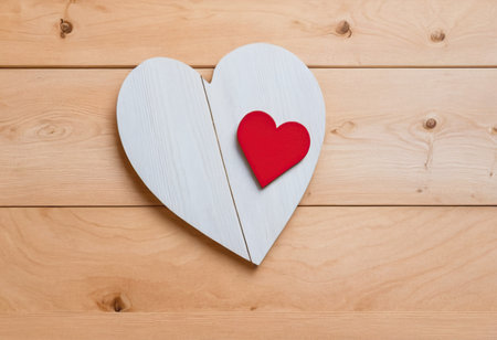 Two wooden hearts on a wooden table. Valentine's day concept.