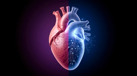 Human heart with digital circuitry on dark background in futuristic concept style. . High quality photo