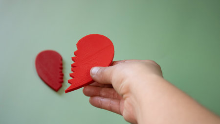Cracked heart sculpture features red and silver textures, symbolizing emotions and creativity. The artwork stands out against a plain background.