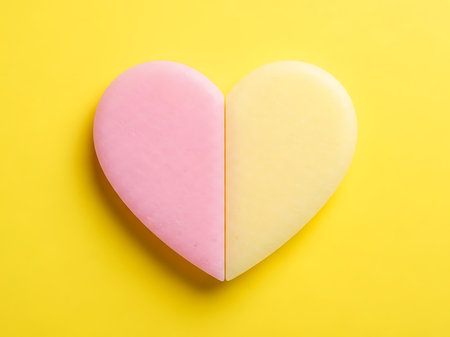 The image features a heart shape divided into two distinct halves, each with a different color. The left half is a soft pink, while the right half is a light yellow. The heart is set against a bright yellow background, creating a vibrant contrast. This visual representation can symbolize duality, balance, or the combination of two differing elements.