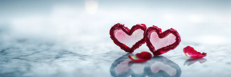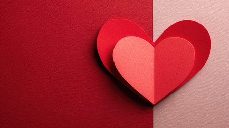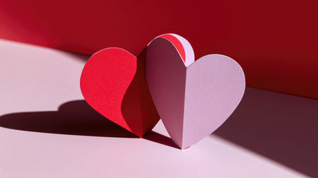 Two artistic paper hearts in red and pink create a charming scene with soft shadows on a textured background, perfect for illustrating love and romance.