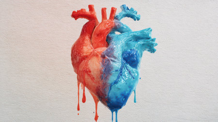 A heart crafted from melted wax glows in warm red and cool blue, gently dripping onto a watercolor canvas, creating an emotional contrast.