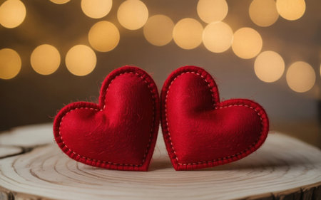 Two Red Fabric Hearts With Soft Bokeh Lights Background