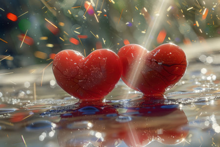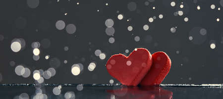 Two red hearts with rain drops illuminated by warm light on dark background with a bokeh. Photo with copy space.