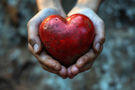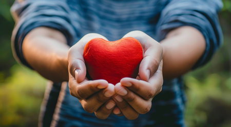 A person is joyfully holding a bright red heart symbolizing deep love, compassion, and genuine kindness towards others