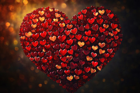 A heart made of red and gold hearts, set against an elegant dark background. The composition is symmetrical with the main focus on the large central heart. This design evokes feelings of love, romance, and celebration for Valentine's Day or special events. --ar 3:2 --v 6.1 Job ID: 6162b19a-40d2-43c4-8508-7668582fb27a