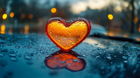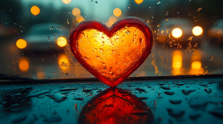Orange heart shape on a rainy car windshield, reflecting ambient lights, symbolizing love and nostalgia.
