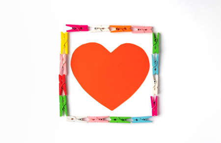 Red heart inside square made with multicolored wooden clothespins on white background.