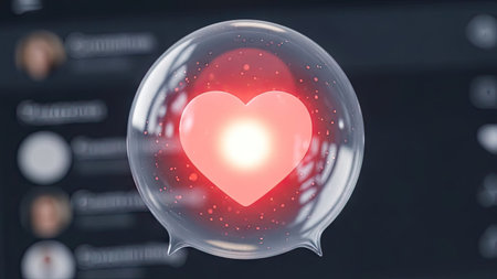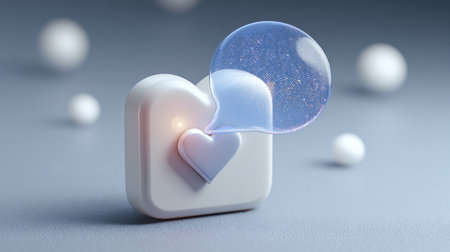 A vibrant red heart icon, framed in a speech bubble, floats above a blurred backdrop. The image features a bright, neon-like glow with a shallow depth of field. The overall style suggests a digital or conceptual visual, ideal for design templates, social media content, or marketing materials.