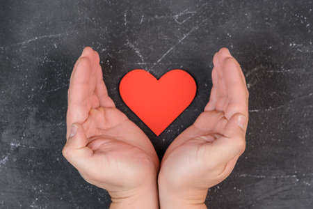 Men's palms embrace a red heart symbol on a dark background, selective focus