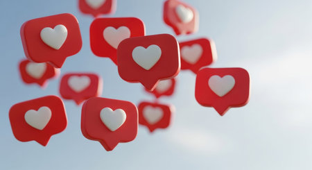 A glossy red heart is the central focus, encircled by glowing social media icons like likes and shares. The image uses a digital rendering style with vibrant colors and a gradient background. It may be suitable for marketing, website design, or content related to love, communication, or virtual engagement.