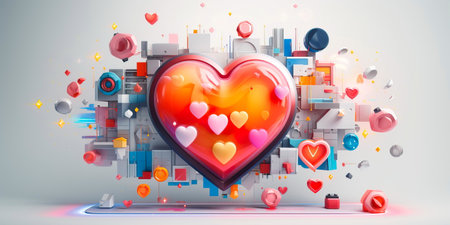 A vibrant 3D render showcases a large, glossy red heart encircled by various social media icons. The composition features a gradient background with soft hues. Elements like speech bubbles and emoji add visual interest. This imagery is suitable for digital content, advertising, and designs related to social interactions.