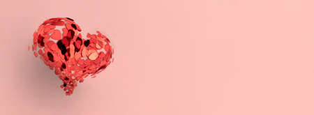 red heart is a symbol of love made of sequins and confetti on a pink background, minimalism panoramic concept copyspace