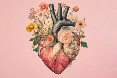A detailed vintage-style illustration of an anatomical heart intertwined with delicate flowers and foliage, set against a soft pink background. A symbolic fusion of nature, love, and life.